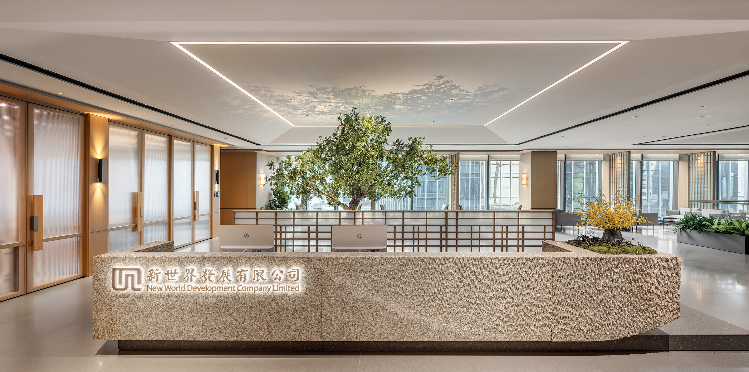 The HQ2’s interior reflects a contemporary interpretation of this ancient concept, fostering an environment that strengthens connections between colleagues. At the heart of the design is the central courtyard, present on every floor, which is symbolized most notably in the 10/F reception area. A black granite pool with a central tree enhances a sense of calm and nature, while a granite monolithic reception desk, crafted with rough and polished textures, echoes the craftsmanship central to New World Development’s ethos.