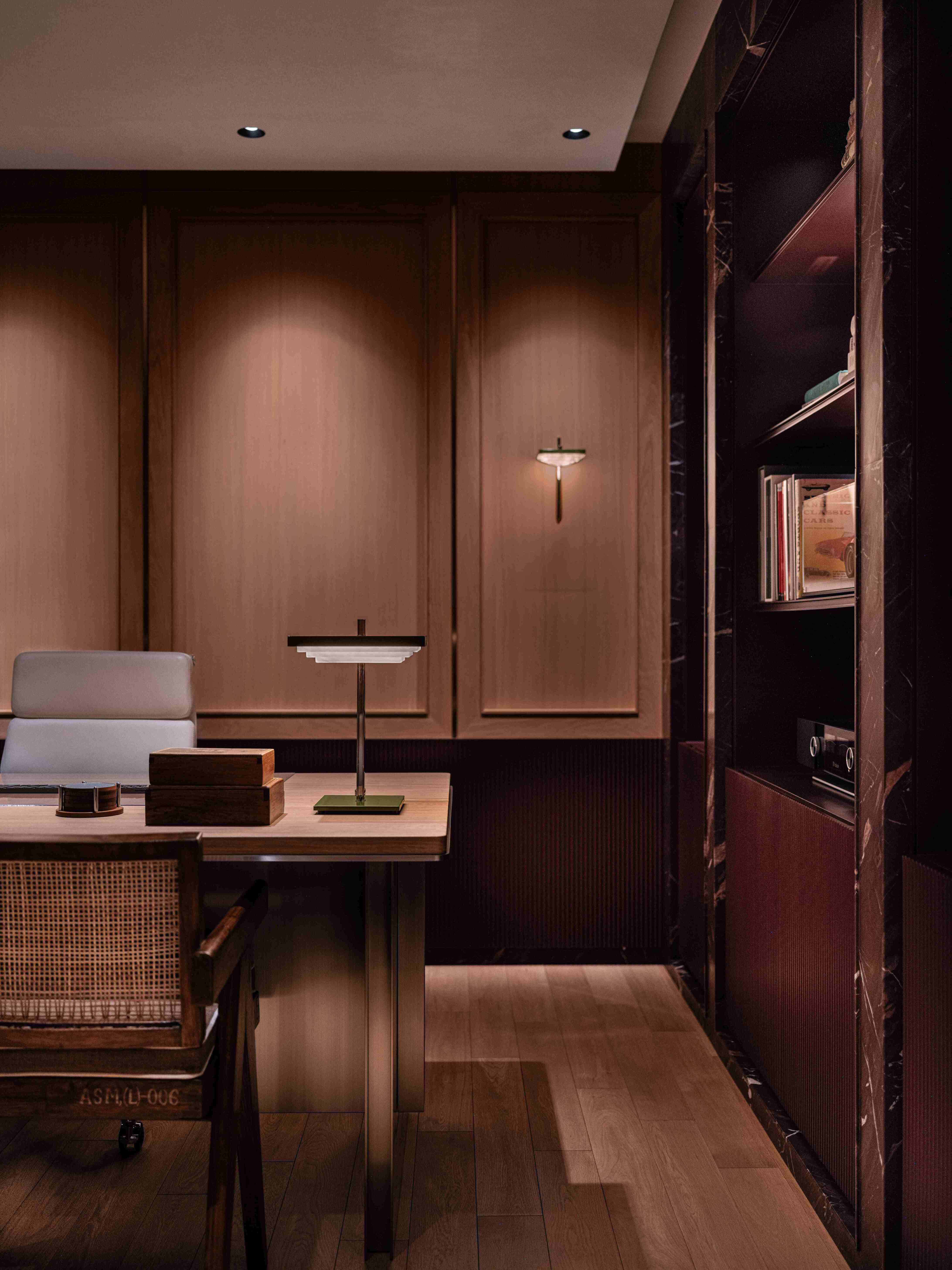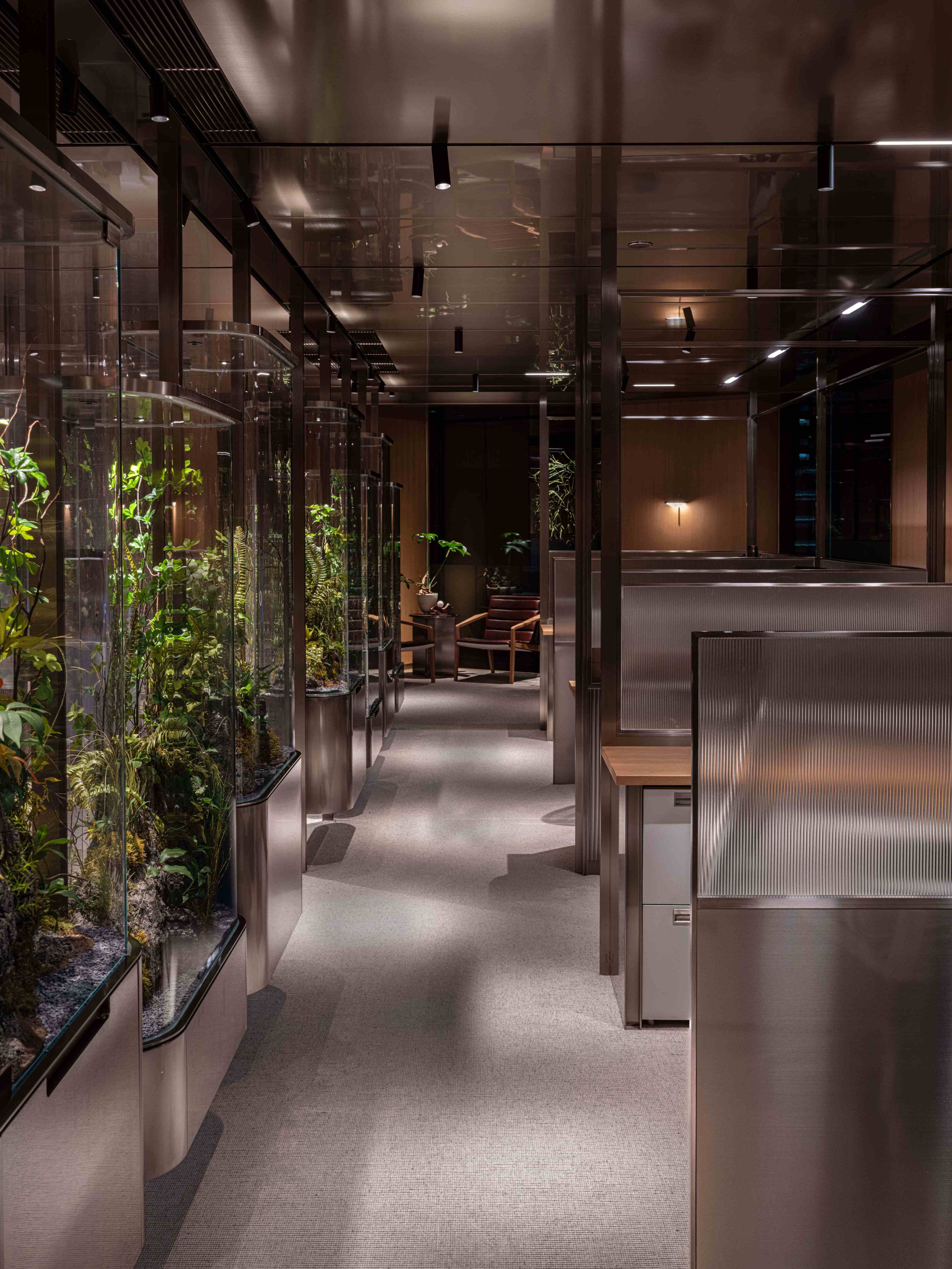 Tasked with reimagining a workspace within a constrained floorplan, we transformed limitations into opportunities. Glass brick partitions diffuse natural light into communal areas while ensuring privacy, complemented by fluted glass and stainless steel to amplify luminosity. Circular mid-century motifs soften the space, aligning with the client’s aesthetic. A custom timber wall system showcases their art with flexibility, while maintaining curation. Terrariums with native Ficus species introduce greenery and natural air purification. Lighting synchronized with circadian rhythms mirror daylight transitions for a self-regulating environment. Collaborations with local artists and a botanist root the design in Hong Kong’s cultural and ecological context. Custom parquetry and furnishings celebrate regional craftsmanship, while the terrariums symbolise the city’s adaptability. A pavilion-like structure balances transparency and seclusion, reflecting Hong Kong’s interplay of public and private life. Anchored by the family crest, the space is a living narrative of legacy, well-being, and cultural authenticity—functional yet deeply personal.