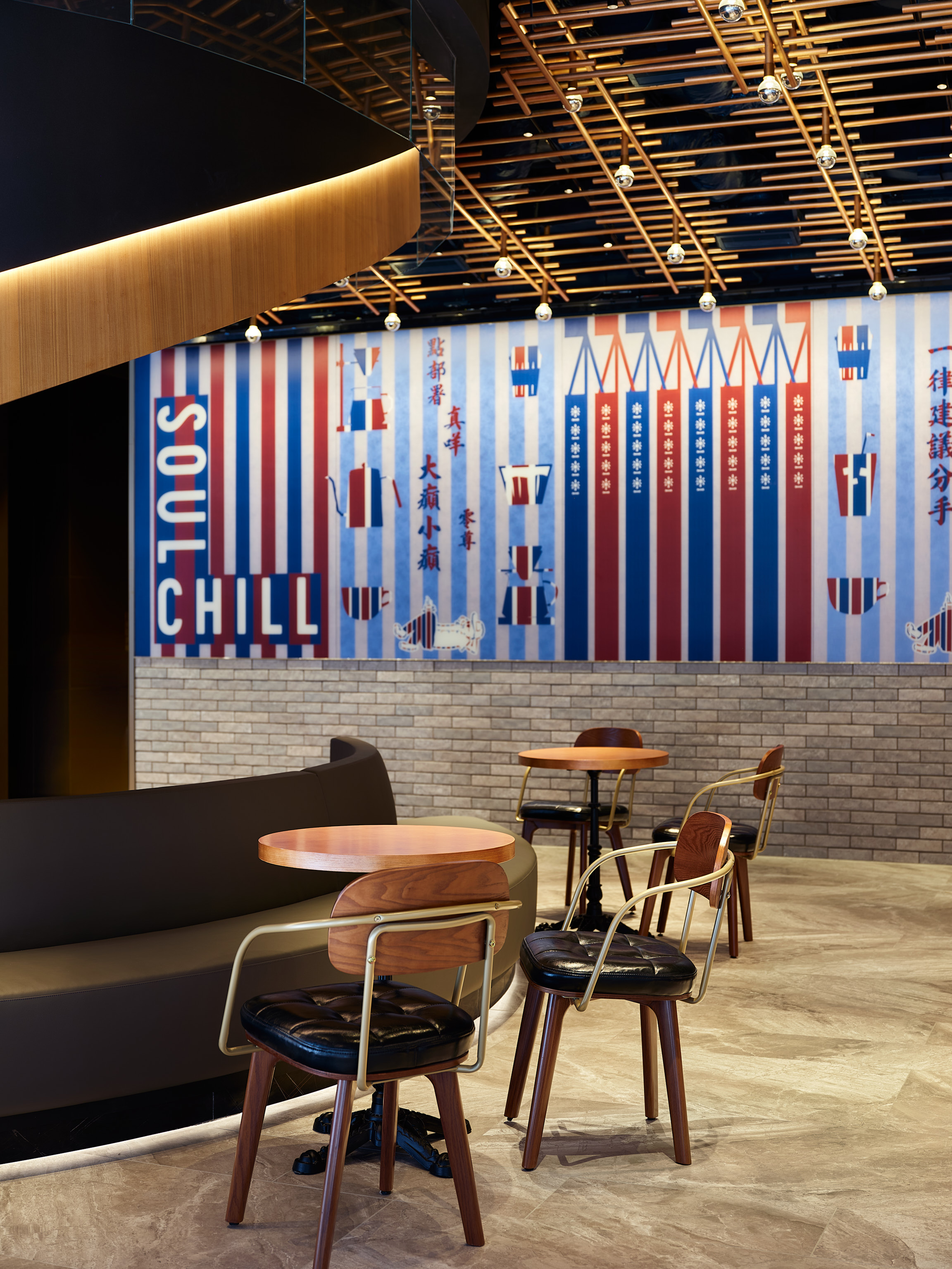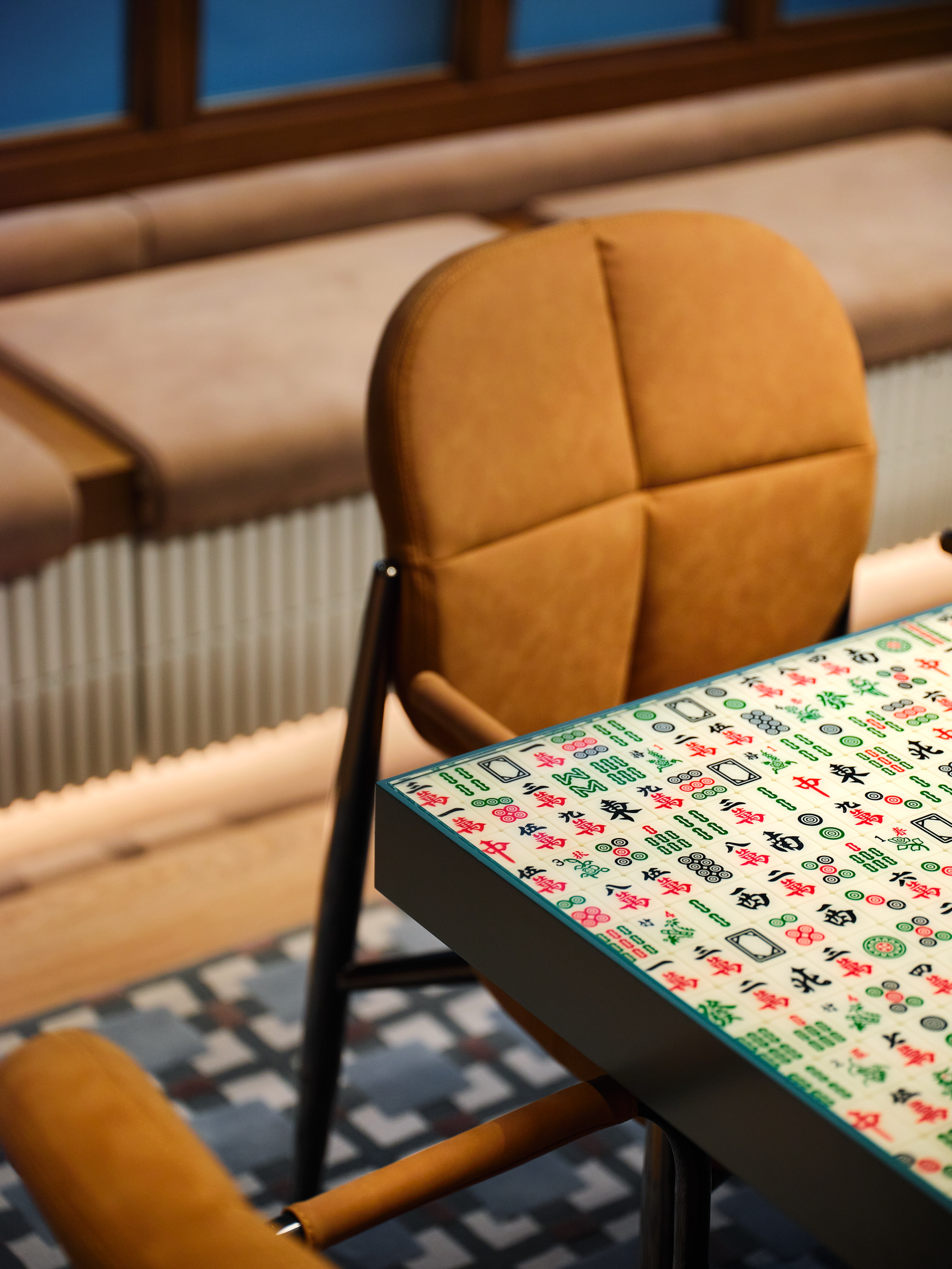 The 5/F Club mixes cha chaan teng energy with modern comfort. Leather booths, antique mailboxes salvaged from the old Bedford neighborhood, accustom-made mahjong conference table, and mosaic carpets evoke local nostalgia. The gym features hand-woven basket lighting and retro green mesh walls. The rooftop terrace, with recessed seating, is perfect for al fresco dining, mirroring the city’s bustling street life.