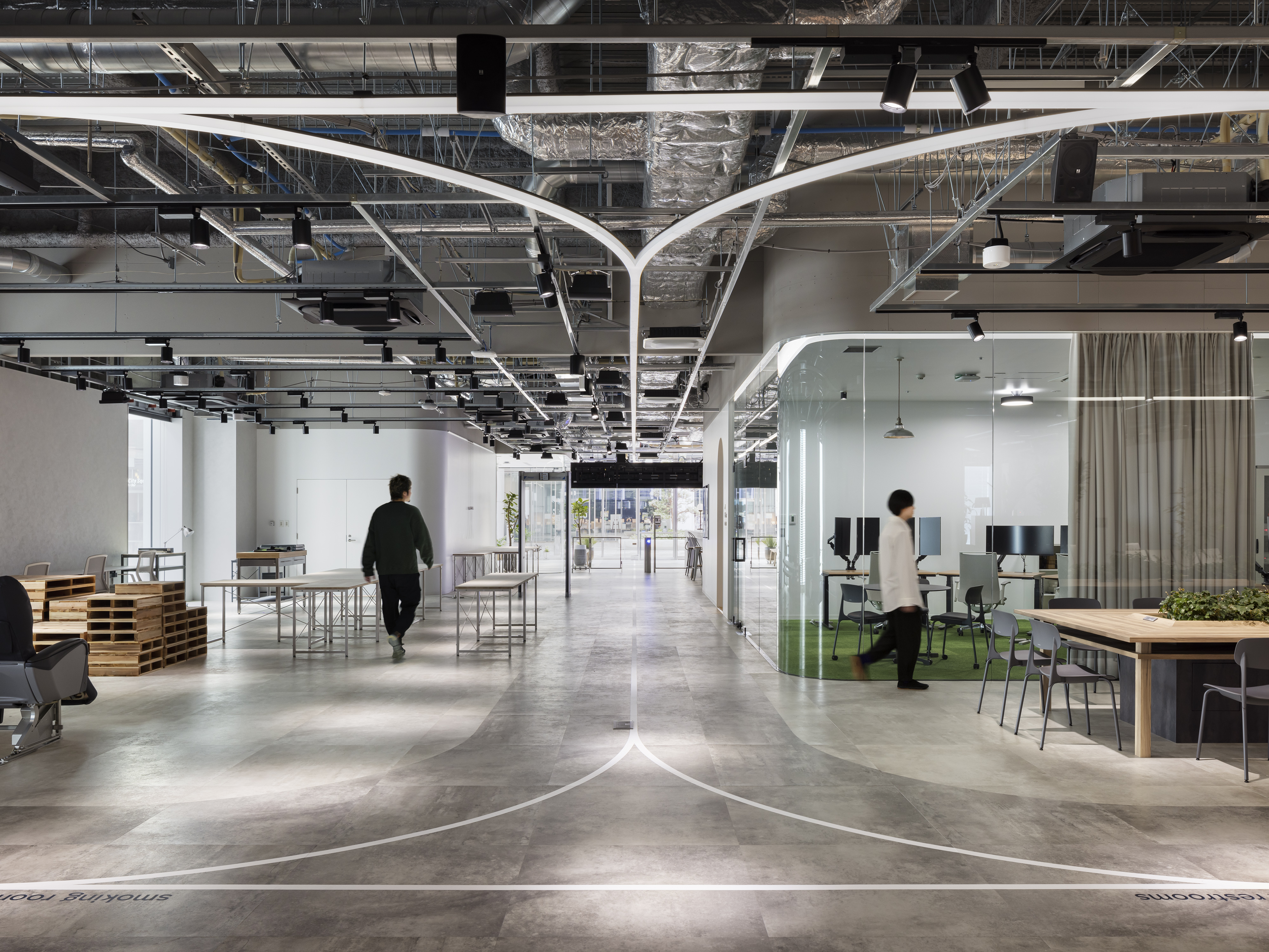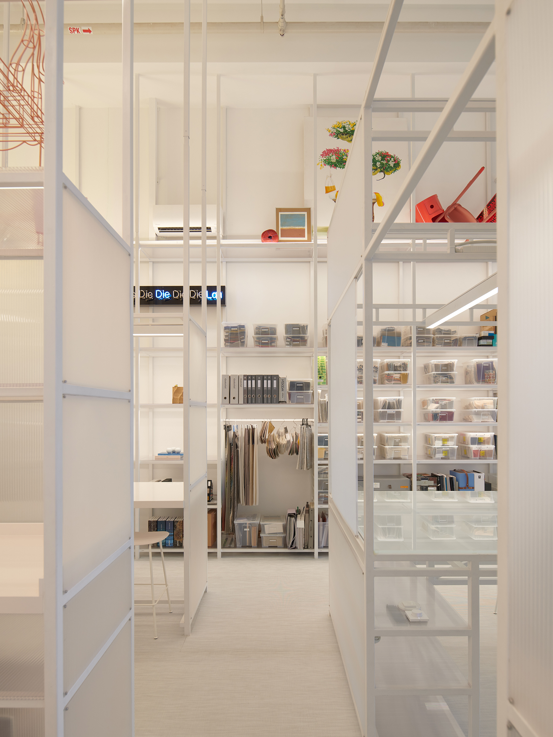 The Workshop features layered 3D metal scaffolding, creating seamless zones and visibly housing our extensive material library. At its heart is a central, counter-high frosted tempered glass "war room" table, perfect for material explorations and design discussions. A custom adjustable lighting system above allows for light simulations when reviewing samples, alongside a magnetic display wall.