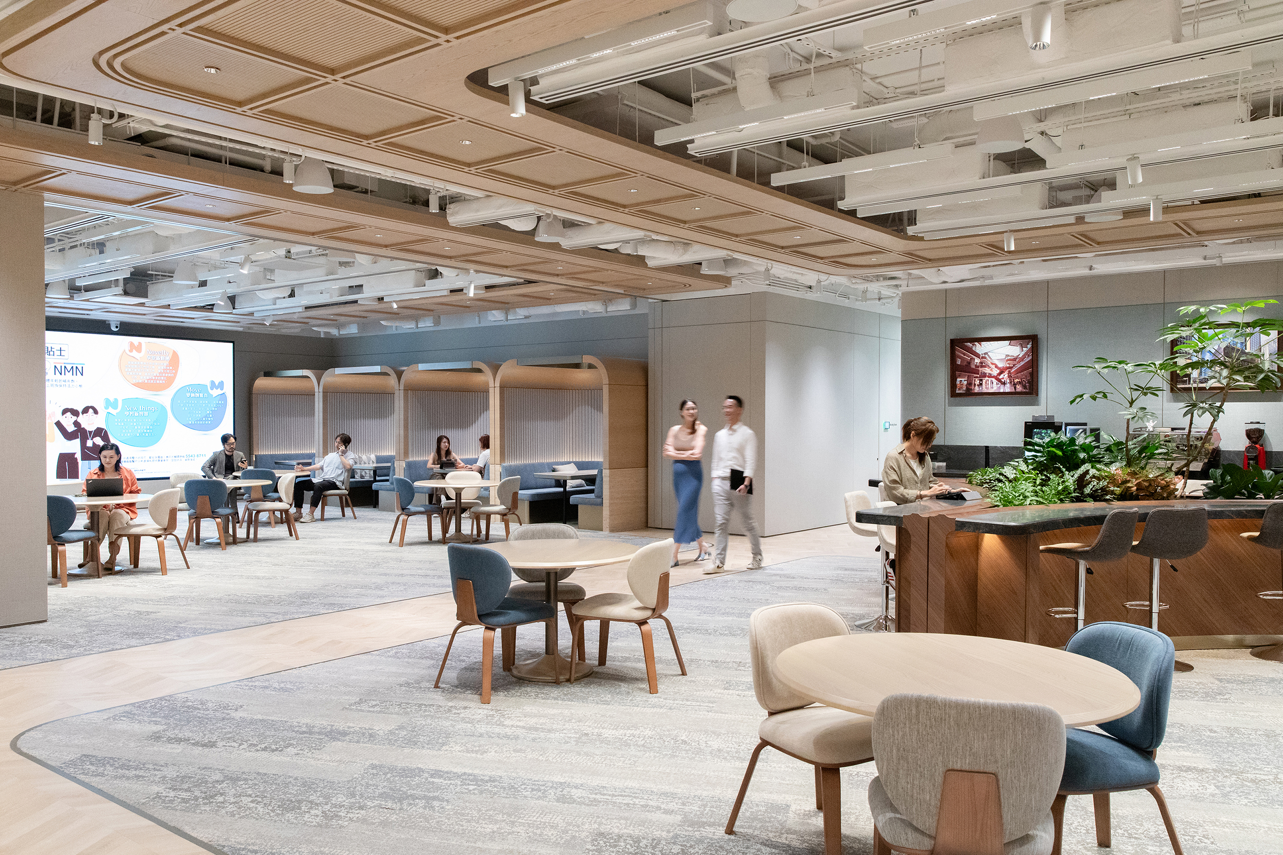 Behind it, the cafe’s bamboo-scaffold-inspired cropper ceiling adds cultural flair. Digital wayfinding further caters to tech-savvy visitors. The 3/F sky garden offers city views with curved seating under a baffle ceiling, reflecting Hong Kong’s communal vibe.